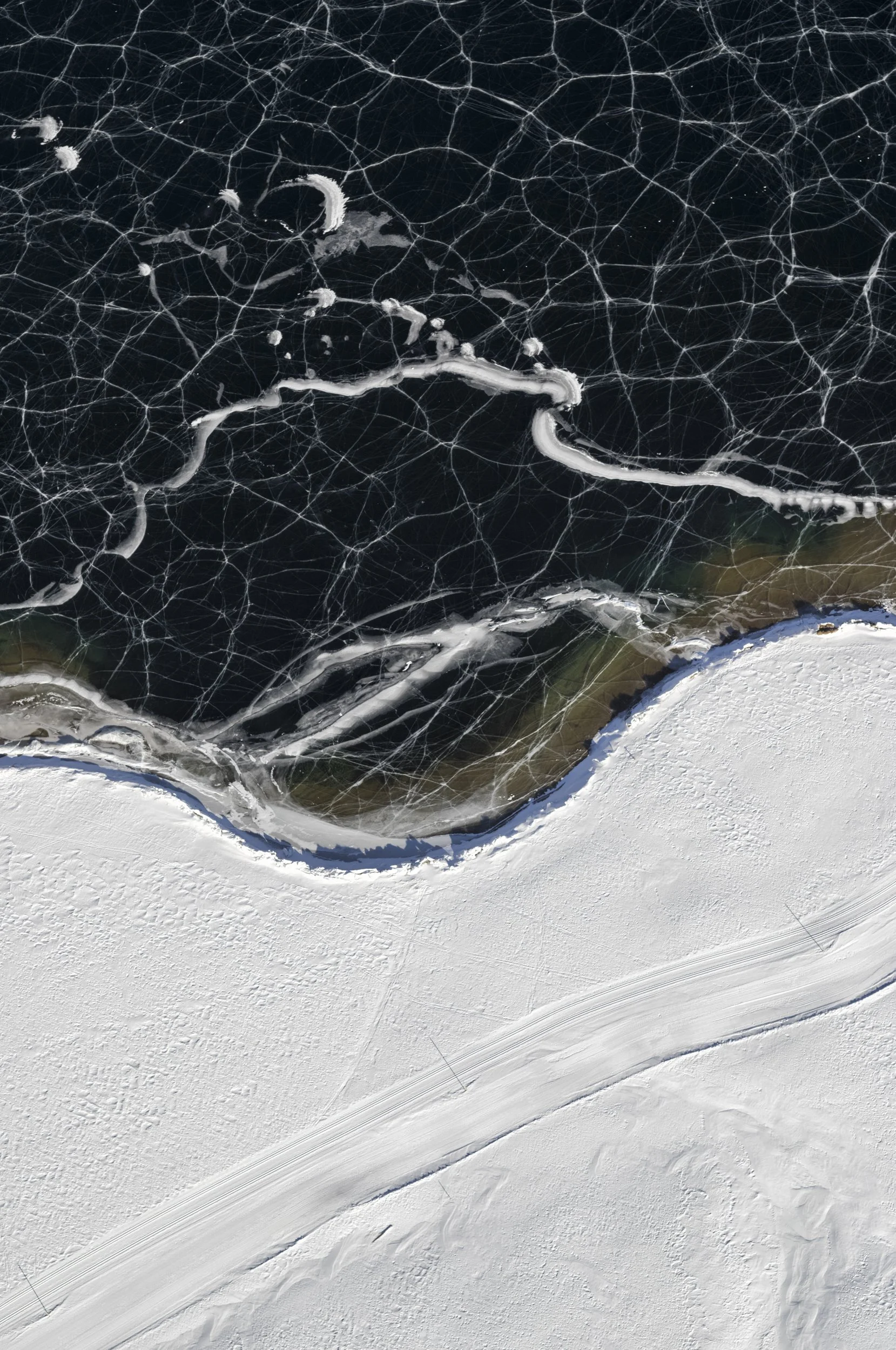Surface Tension is a photographic project by photographer Daria Troitskaia, examining landscapes from above at the fragile meeting points between water, ice, and land.